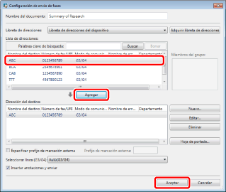 Seleccione el destino en [Lista de direcciones] y haga clic en [Agregar] > [Aceptar].