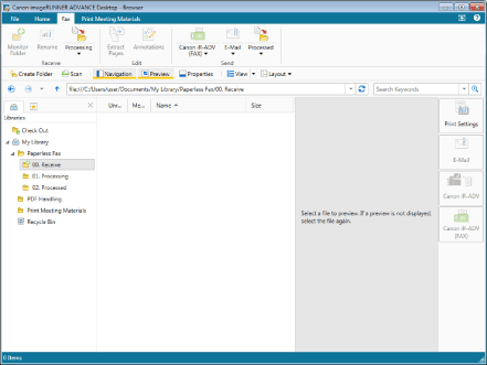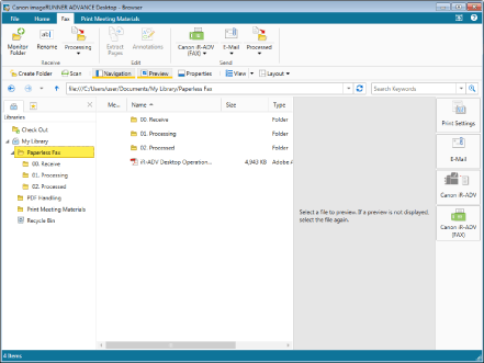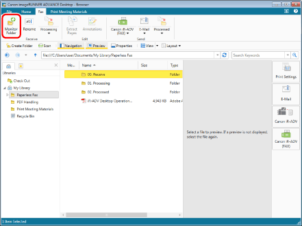 Without selecting a document or folder, click [Processing] on the [Fax] tab. The content of the "01. Processing" folder is displayed. (This can be used as a shortcut.)