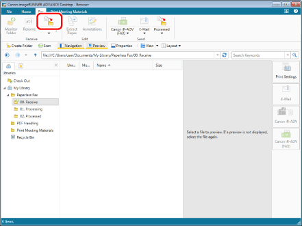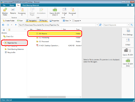 Select the [Fax] tab to switch the ribbon display. Select the "00. Receive" folder in the "Paperless Fax" folder.