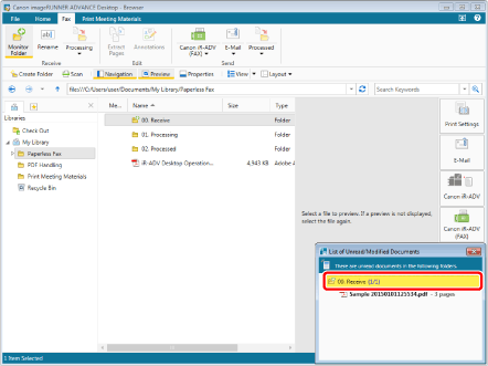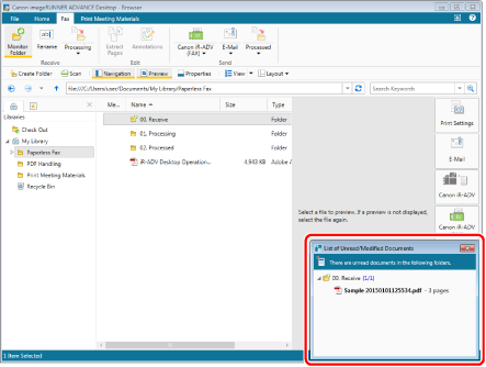 When a fax is saved in the "00. Receive" folder, the [List of Unread/Modified Documents] is displayed on the computer screen.