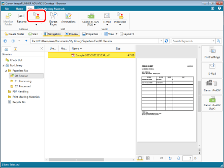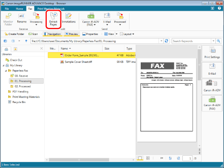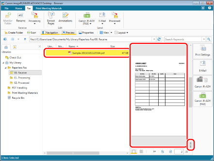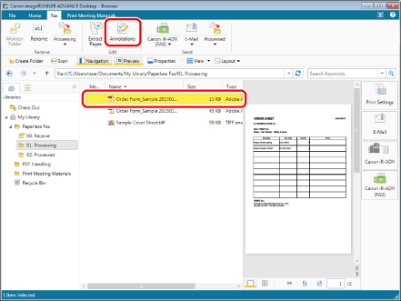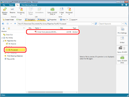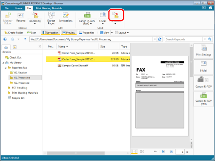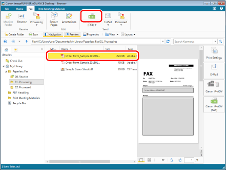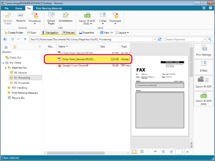 Select the sent fax in the "01. Processing" folder (for this example, "Order Form_Sample 20150101125534.pdf").