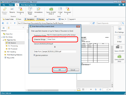 The string entered in [Character Strings] in [Enter Name of Document to Send] is added to the document name. For this example, enter "Order Form", and click [OK].