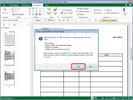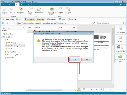 Click [Yes] in the displayed confirmation message. The extracted page is saved. (For this example, "Order Form_Sample 20150101125534_1.pdf").