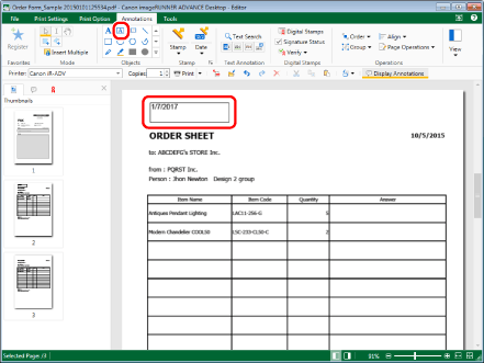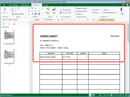 Select "Order Form_Sample 20150101125534.pdf", and click [Annotations] on the [Fax] tab. Desktop Editor is started in a separate screen.
