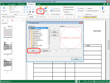 Select [Stamp] on the [Annotations] tab > [Manage Stamps], and click [Add] in [Manage Stamps].