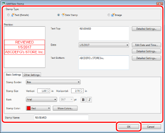 Using the screen shown here as a reference, input the contents of the stamp. Once finished, click [OK], and click [Close] in the [Manage Stamps].