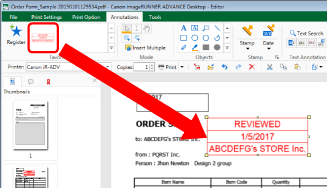 Select the stamp that you created from [Stamp] on the [Annotations] tab, and insert it into the document. After inserting the stamp, click
