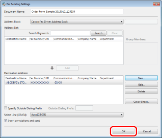 Click [New] in [Fax Sending Settings], enter the recipient information in [Add New Destination Addresses], and click [OK].