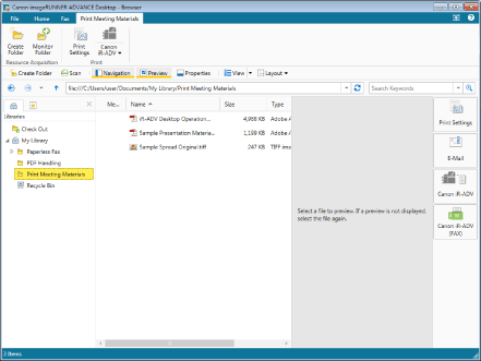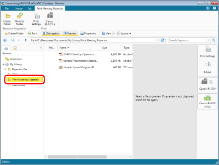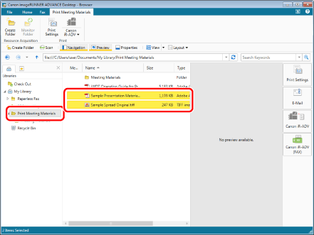 Select the "Print Meeting Materials" folder, then select "Sample Presentation Materials.pdf" and "Sample Spread Original.tiff" while holding down the [Shift] key on the keyboard.
