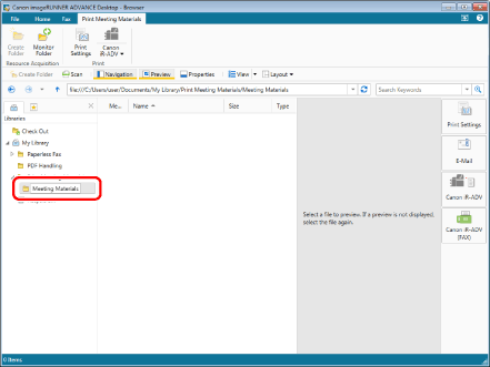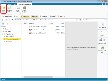 For example, your company has a regular meeting every month. Since various materials are required at these meetings, these materials must be collected and printed. By using the [Print Meeting Materials] tab registered when Desktop is installed, you can efficiently prepare these materials. The [Print Meeting Materials] tab is set with functions specialized for printing work.