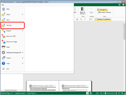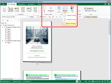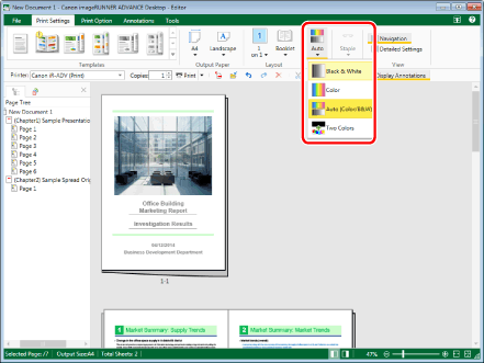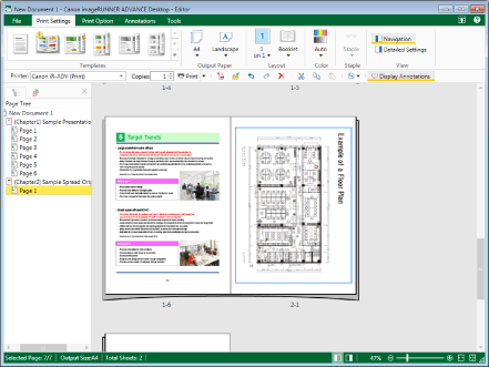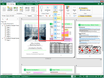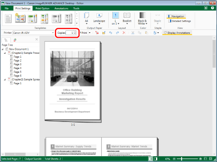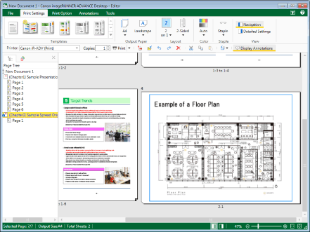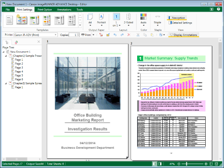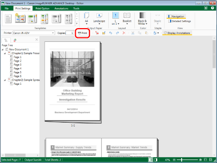 With Desktop, you can save specified print settings with a document or register them as a template. In addition, you can print a document after checking a print preview with the print settings applied, helping prevent misprints.