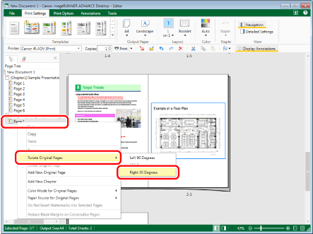 In the Page Tree, select Page 1 of "(Chapter 2) Sample Spread Original", then right-click and select [Rotate Original Pages] > [Right 90 Degrees].