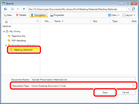 Select the "Meeting Materials" folder, check that [Canon Desktop Document (*.iwb)] is displayed for [Document Type], then click [Save].