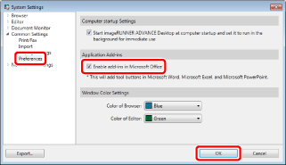 Click [Common Settings] > select the [Enable add-ins in Microsoft Office] check box in [Preferences], and click [OK].
