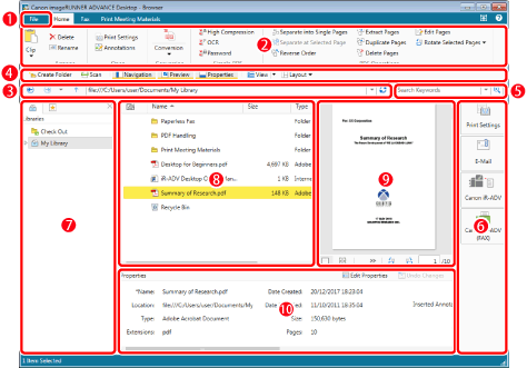 The ribbon includes tabs with commands for performing operations on and editing documents stored in libraries and commands for sending and receiving faxes and printing materials.