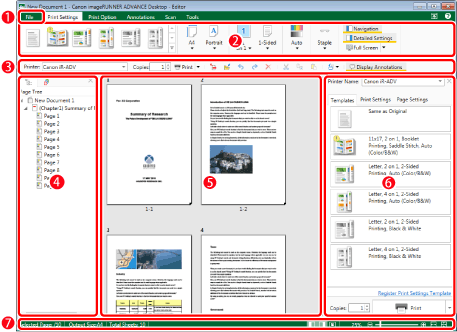 Displays the total number of document pages, page number of the currently selected page, output paper sizes, and the number of sheets to be printed. You can also perform the following operations.