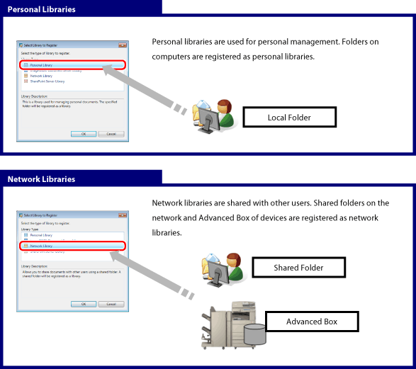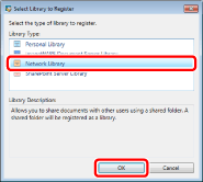 A Network Library is a folder for managing documents on a network. To share documents with other users, register the folder on the network as a Network Library.