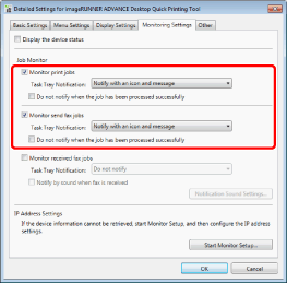 4. For imageRUNNER ADVANCE Desktop and imageRUNNER ADVANCE Desktop - Printer Monitor, set [Show icon and notifications], then click [OK].