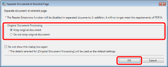 If you select this check box, [Separate Document at Selected Page] is not displayed when dividing a document next time. The settings in [Original Document Processing] are used as the default values when this item is selected.
