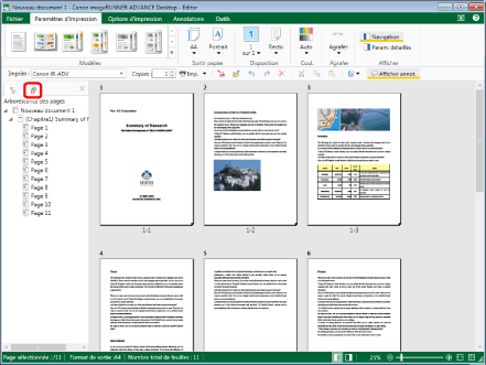 (Miniatures) : affiche les miniatures de pages du document. Il est possible de sélectionner les pages à afficher ou modifier en cliquant sur les miniatures correspondantes.