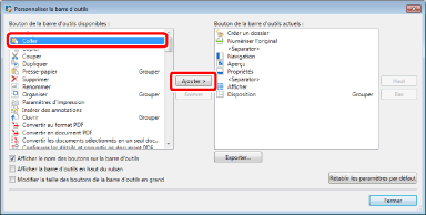 Sélectionnez le bouton d'outil à afficher dans la barre d'outils à partir de [Bouton de la barre d'outils disponibles], puis cliquez sur [Ajouter].