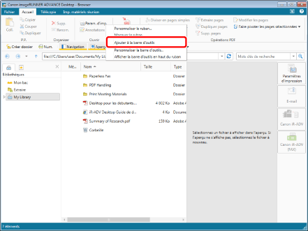Cliquer avec le bouton droit sur la commande à ajouter à la barre d'outils sur le ruban, puis sélectionner [Ajouter à la barre d'outils].