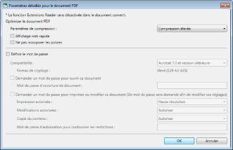 Lors d'un enregistrement au format PDF, les paramètres suivants ne peuvent pas être définis.