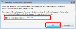 [Confirmer le mot de passe d'autorisation] est affiché lorsque la case [Demander un mot de passe pour imprimer ou modifier ce document (Un mot de passe sera demandé afin de modifier ces réglages)] est sélectionnée.