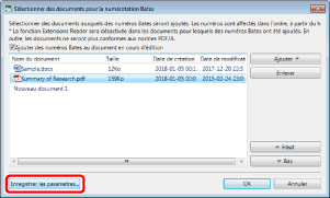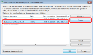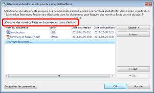 En cas de sélection de [Utiliser le nom de fichier original] dans [Spécifier un nom de fichier], le nom de document affiché dans la liste [Sélectionner des documents pour la numérotation Bates] est utilisé comme nom du document PDF.