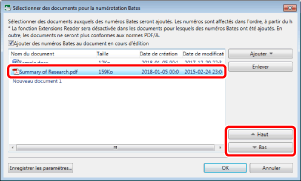 Lors de la conversion de plusieurs documents en document PDF, un nombre de Bates est ajouté aux documents à partir du document affiché en haut de la liste.