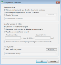 En cas de sélection de [Mêmes emplacements que dans les documents originaux] dans [Enregistrer dans], le document PDF est enregistré dans [Mes documents]/[Document] sur l'ordinateur.