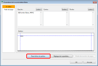 Les éléments affichés dans la liste déroulante lorsque vous cliquez sur [Insérer] et une chaîne personnalisée peuvent être définis pour l'en-tête/le pied de page. Pour définir une chaîne personnalisée, saisissez la chaîne dans la zone de texte dans la position où elle devra être insérée.