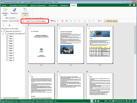 Il n'est pas possible de supprimer le nombre de Bates ajouté au document PDF qui est modifié au moyen du bouton d'outil [Annl]. Pour plus d'informations sur la façon de supprimer un nombre de Bates, consultez la section suivante.
