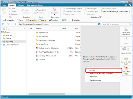 Il est également possible d'effectuer cette opération en cliquant sur ▼ pour le bouton de sortie [Dossier de destination du document] affiché sur le ruban ou la barre d'outils et en sélectionnant [Modifier]. Si un bouton de sortie n'est pas affiché sur le ruban ou la barre d'outils, consulter les sections suivantes pour l'afficher.