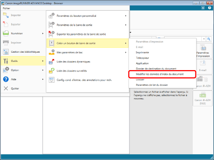 Les boutons de sortie [Modifier les données d'index du document] enregistrés dans la barre de sortie peuvent également être affichés sur le ruban ou sur la barre d'outils. Pour plus d'informations sur leur affichage, consulter les sections suivantes.