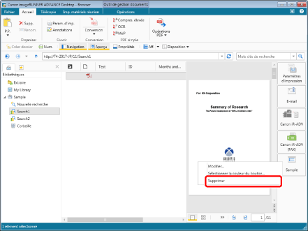 Il est également possible de supprimer un bouton de sortie [Modifier les données d'index du document] à partir de Desktop Editor. Pour supprimer un bouton de sortie [Modifier les données d'index du document] à partir de Desktop Editor, sélectionnez le menu [Fichier] > [Paramètres/gestion] > [Param. du bouton pour Modifier données d'index du doc.] > (nom du bouton) > [Supprimer].