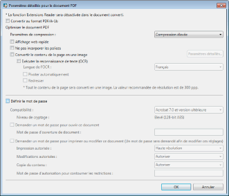 Si vous définissez des paramètres détaillés et convertissez un document PDF doté de la fonction Reader Extensions en un document PDF, Reader Extensions est supprimée.