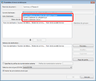 Si vous sélectionnez une adresse ajoutée à [Adresse de destination] et cliquez sur [Modifier], la boîte de dialogue [Modifier les nouvelles adresses de destination] s'affiche pour vous permettre de modifier l'adresse sélectionnée.
