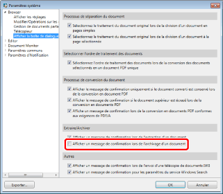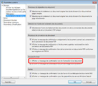 [Paramètres système] > [Browser] > [Afficher la boîte de dialogue] > [Afficher un message de confirmation lors de l'extraction d'un document]