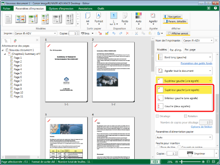Les paramètres qu'il est possible de définir pour la position Éco (sans agrafe) dépendent du type d'imprimante sélectionné dans [Imprim], de l'orientation/du format du papier en sortie et de l'emplacement de la reliure.