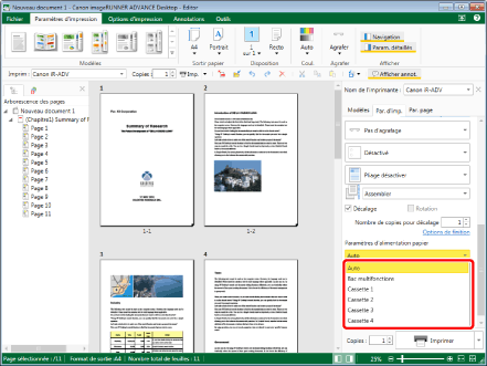 Les paramètres qu'il est possible de sélectionner pour l'alimentation papier du texte du document dépendent du type des alimentations papier dont dispose l'imprimante sélectionnée dans [Imprim].