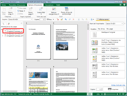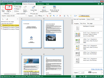 Lorsque le format du papier en sortie est défini sur [Auto (Format)] pour l'ensemble du document ou pour chaque chapitre et que la case [Spécifier le mise en page pour le chapitre sélectionné] n'est pas cochée, si la mise en page est définie sur une valeur autre que [1 sur 1] pour l'ensemble du document, le format du papier en sortie défini pour le chapitre est désactivé.