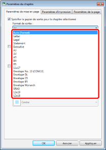 Les options qu'il est possible de sélectionner pour le format de papier en sortie dépendent du type d'imprimante sélectionné dans [Imprim].
