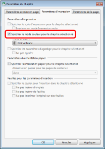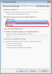 Si l'imprimante Canon sélectionnée dans [Imprim] ne prend pas en charge l'impression couleur, le mode couleur ne peut pas être défini chapitre par chapitre.