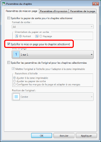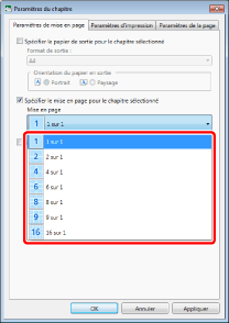 Si [Auto (Format)] est sélectionné dans les paramètres de format du papier en sortie, la mise en page est définie sur [1 sur 1].