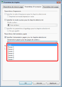 Les objets de paramètres dans [Alimentation papier pour les pages de contenu] varient selon la source de papier et l'imprimante sélectionnées dans [Imprim].