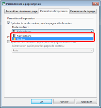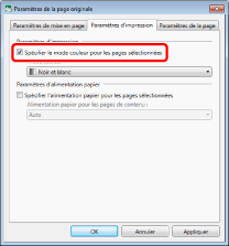 Si l'imprimante Canon sélectionnée dans [Imprim] ne prend pas en charge l'impression couleur, le mode couleur ne peut pas être défini page par page.