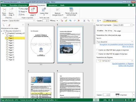 Il est également possible de cliquer avec le bouton droit de la souris sur la page dont les paramètres doivent être modifiés dans l'onglet [Arborescence des pages] de la Fenêtre de navigation et de sélectionner [Ne pas insérer de filigranes dans les pages sélectionnées].