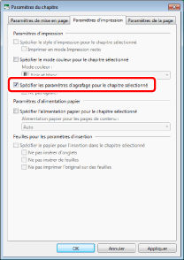 Si l'option de paramètres d'agrafage [Agrafer chaque chapitre] est sélectionnée, il est possible d'annuler ces paramètres chapitre par chapitre.