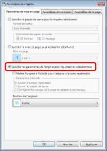 Si un paramètre de zone d'impression différent de celui défini pour l'ensemble du document est spécifié chapitre par chapitre, et si deux paramètres différents doivent être appliqués à la même page à imprimer, le paramètre Impression du chapitre suivant peut être appliqué automatiquement.